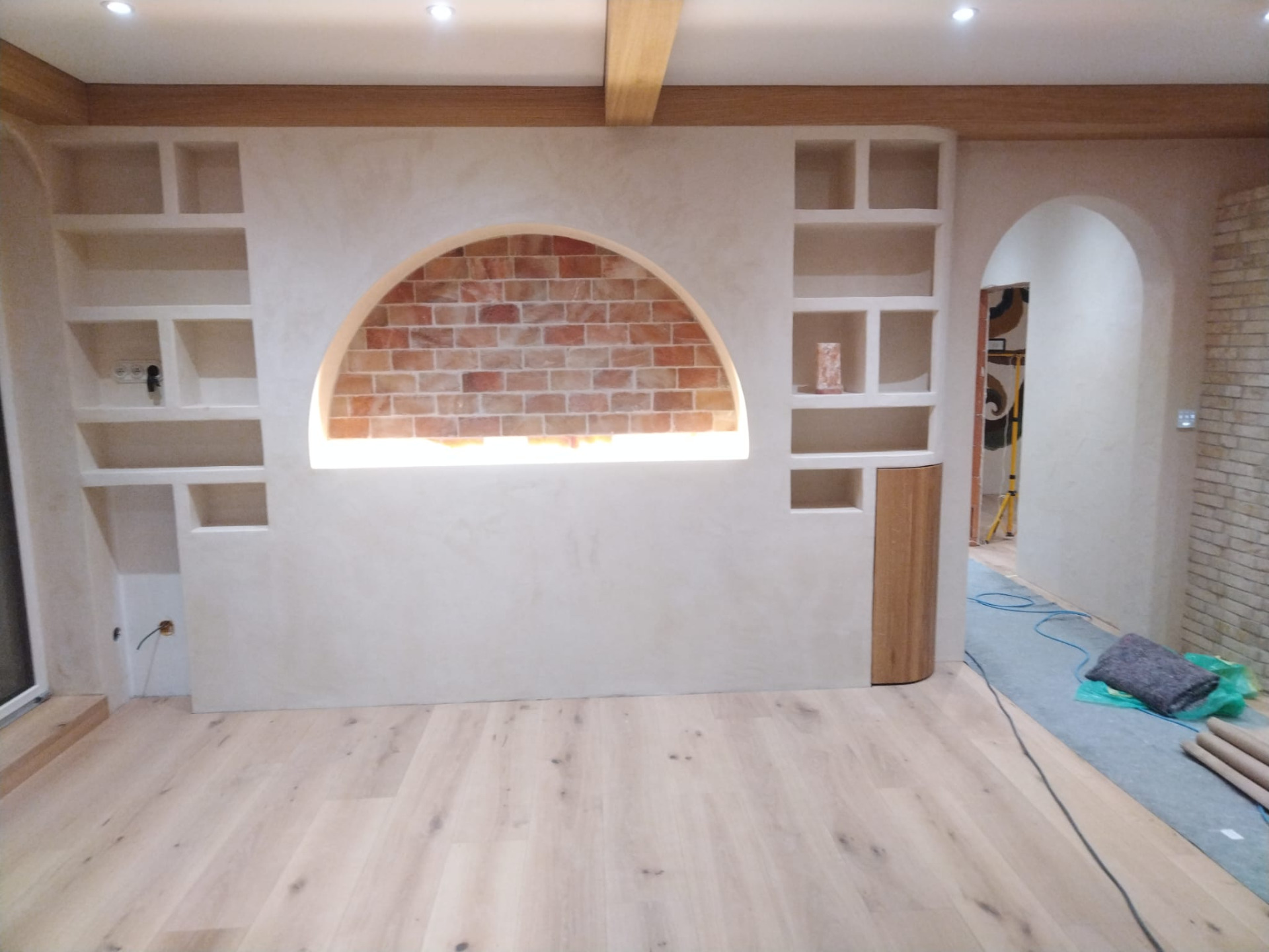 Hladené hlinené omietky vo farbách vanilky. Hladené omietky sú výnimočné najmä tým, že dobre ukážu detaily. (Niektoré obrázky sú robené uprostred schnutia).