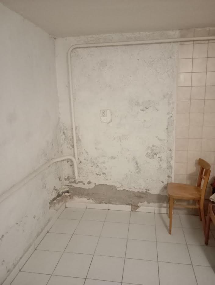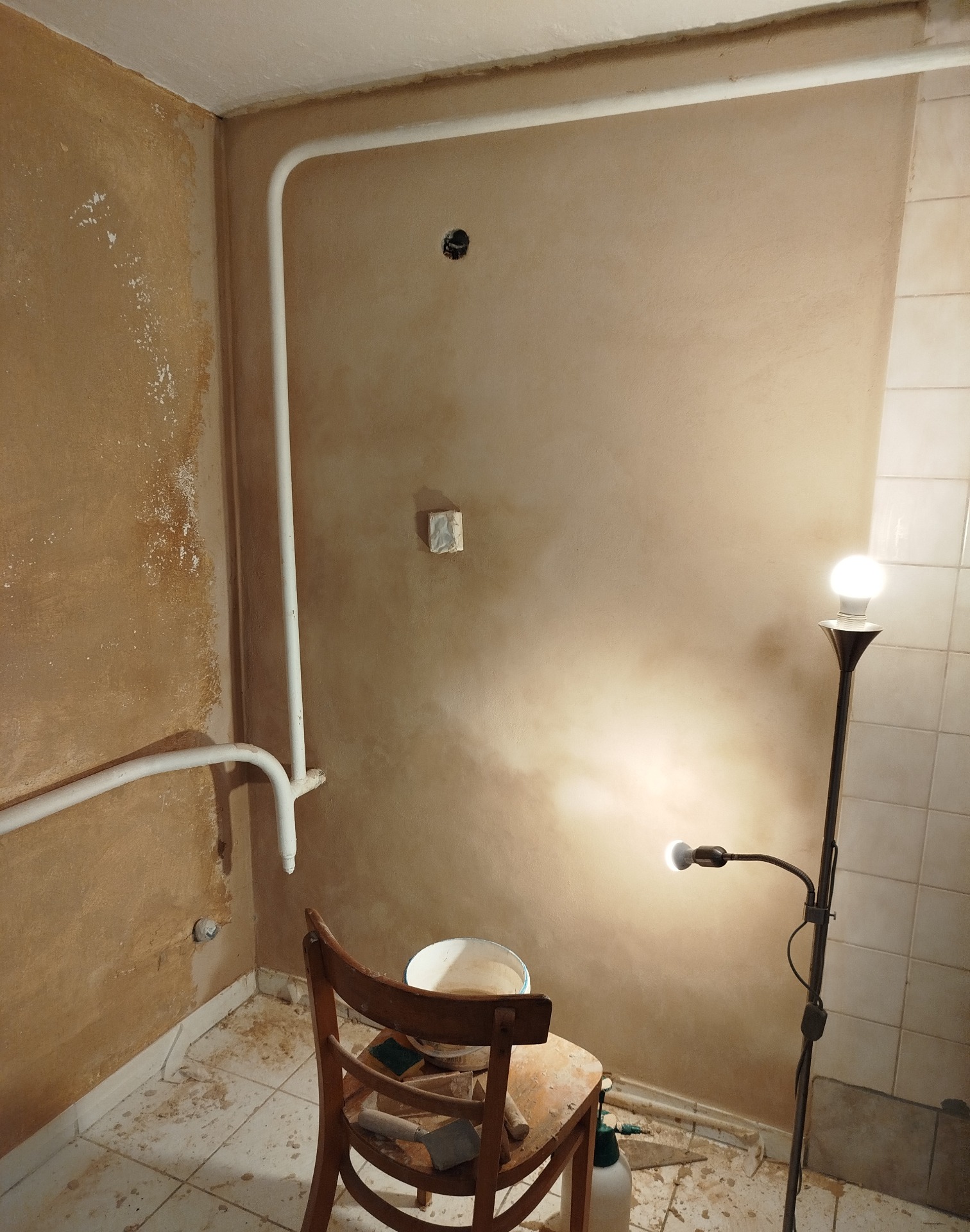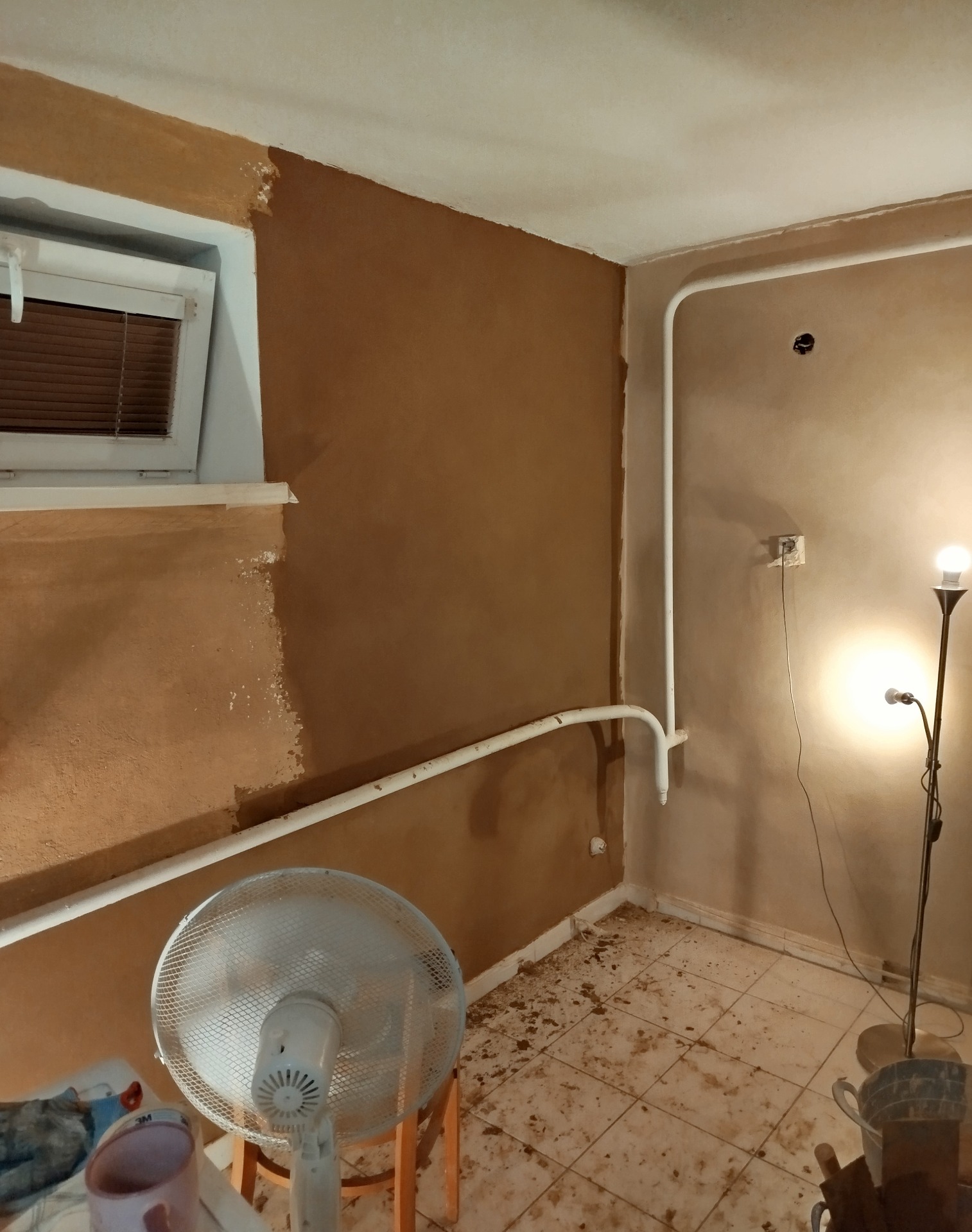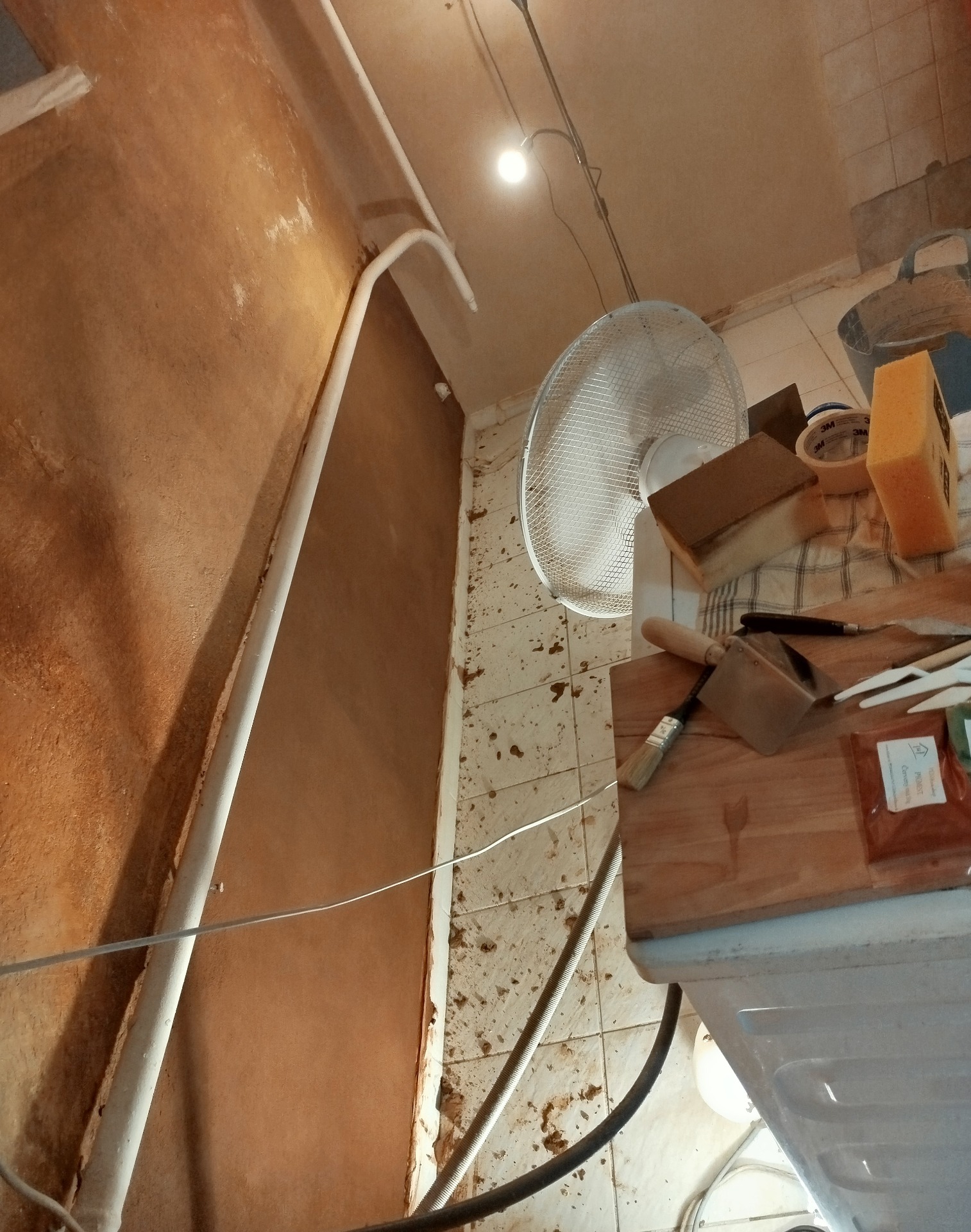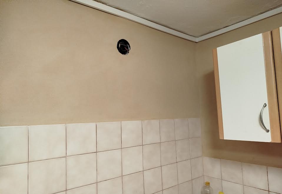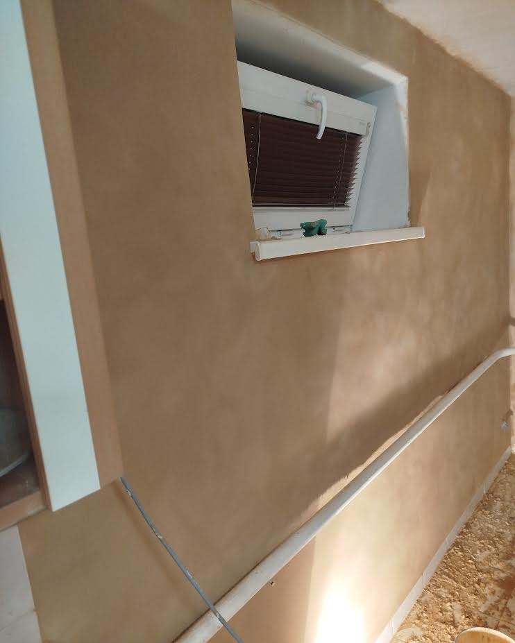 Hlinené omietky v kuchyni, bývalej práčovni. Prvá vrstva - tmavo hnedá hlinená omietka. Finálna vrstva - béžová hlinená omietka.