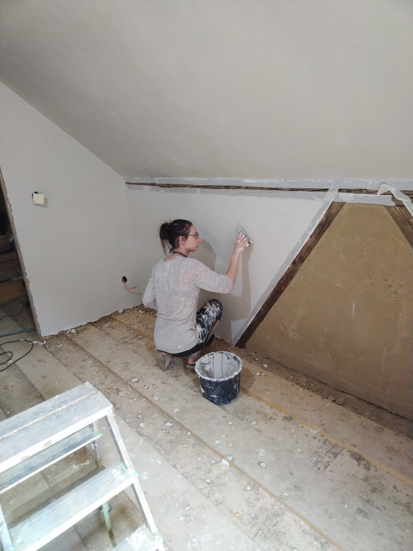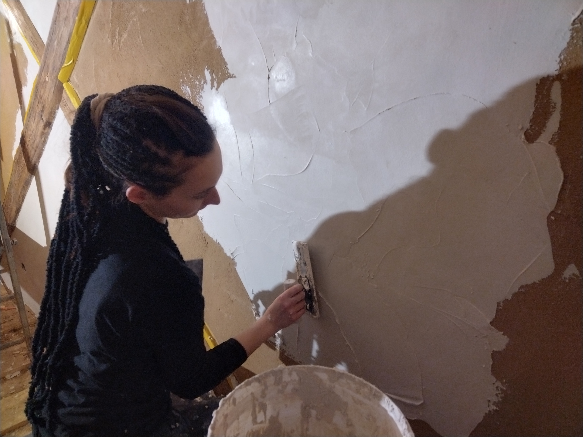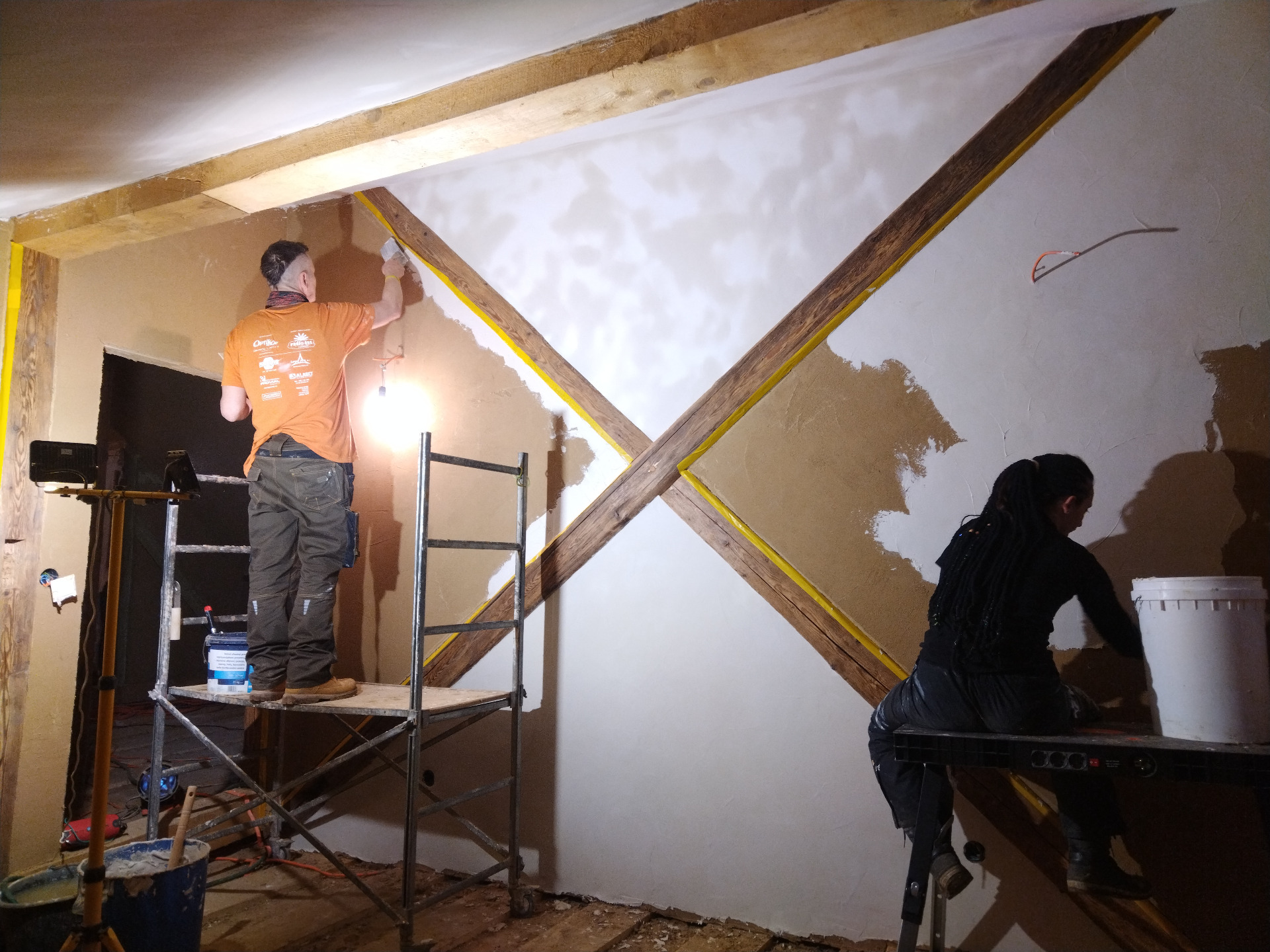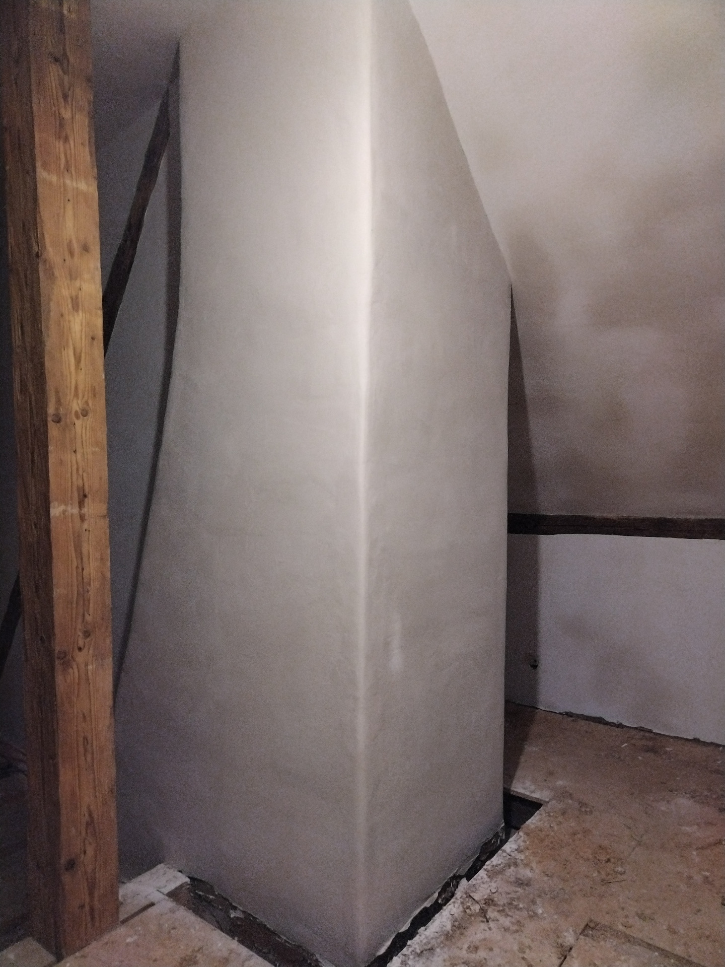Hladené biele hlinené omietky s jemnou štruktúrou vytvorenou pomocou hladítka. Veľa detailov, práca ako stvorená pre mňa.