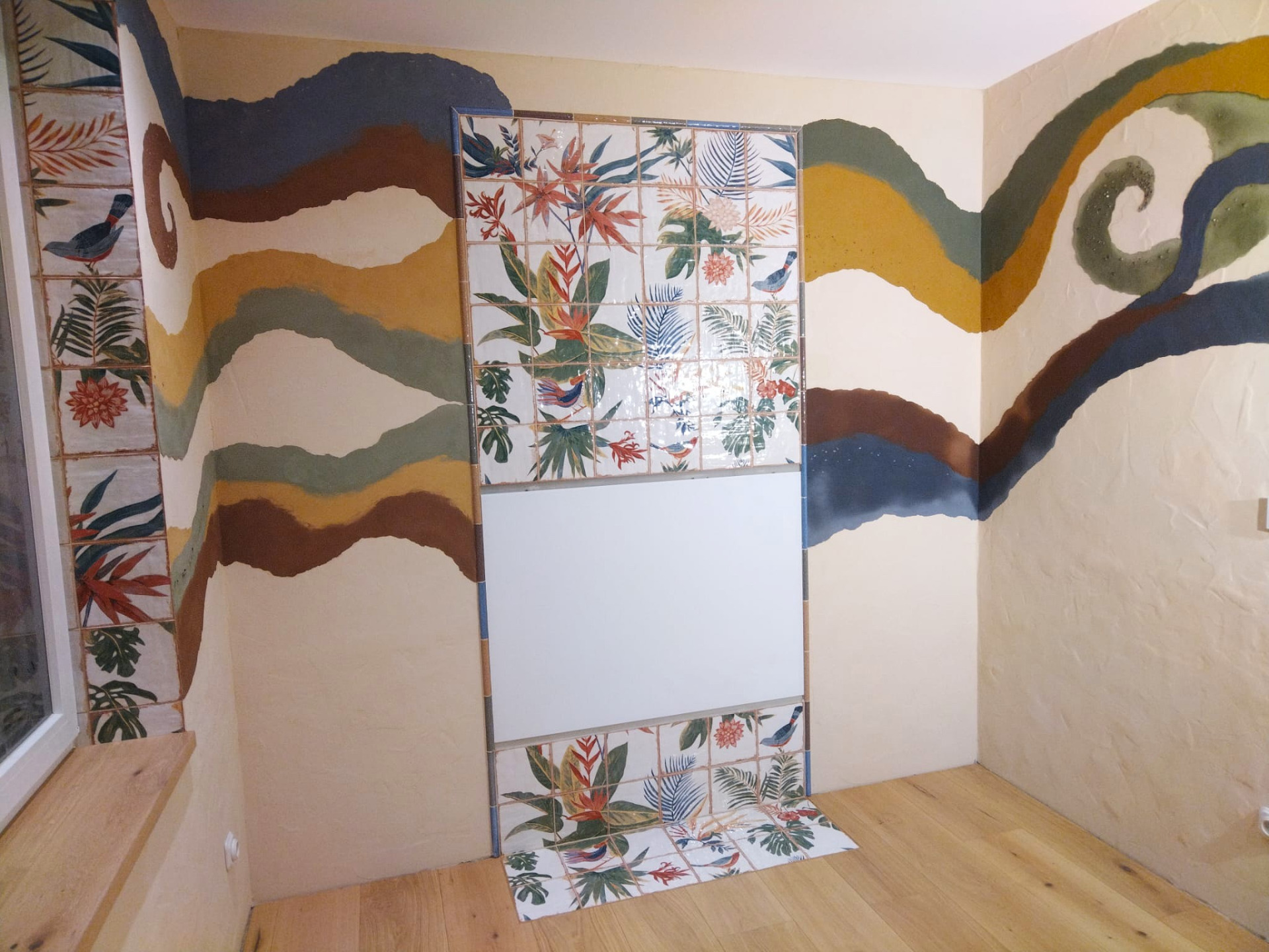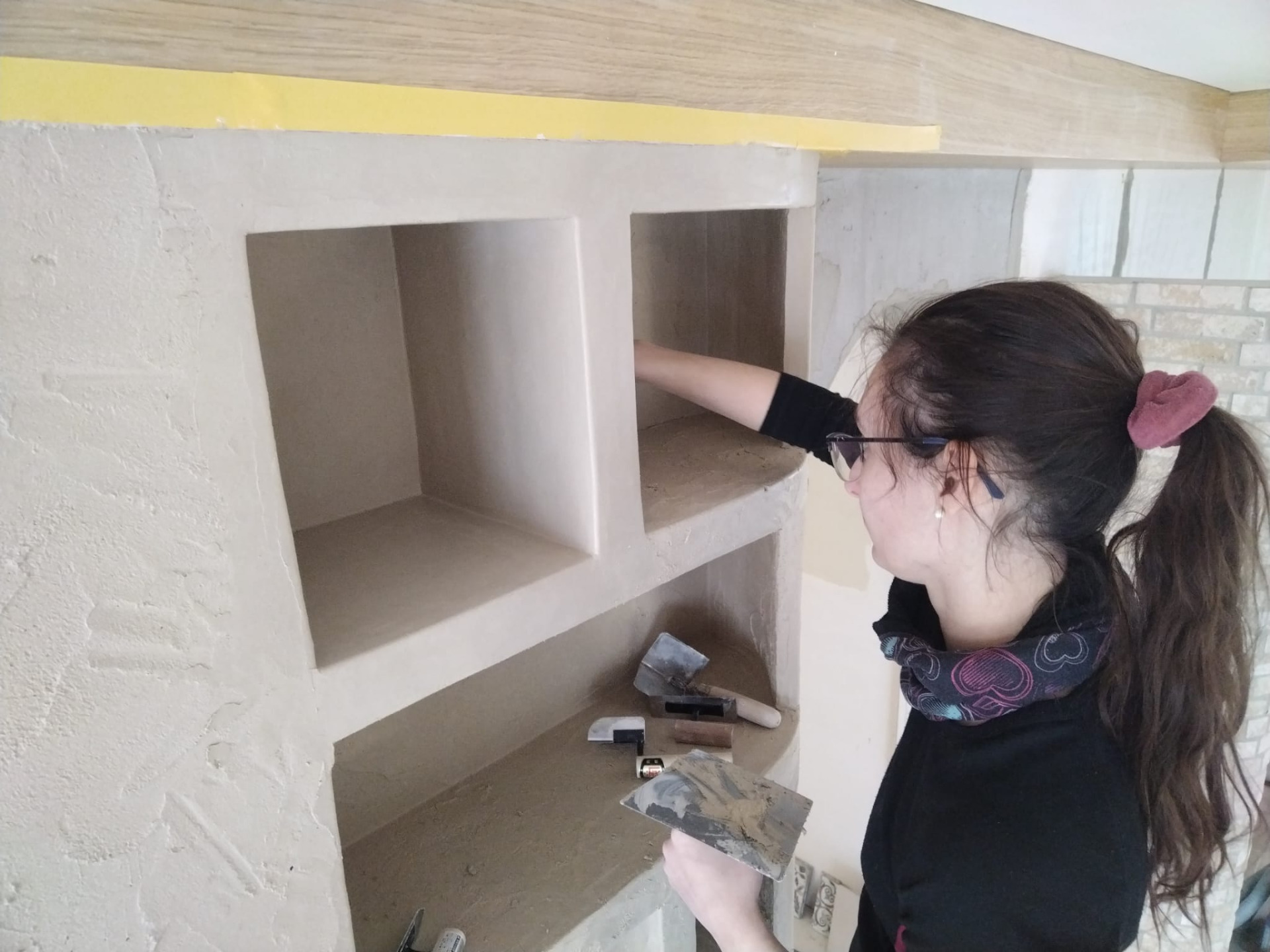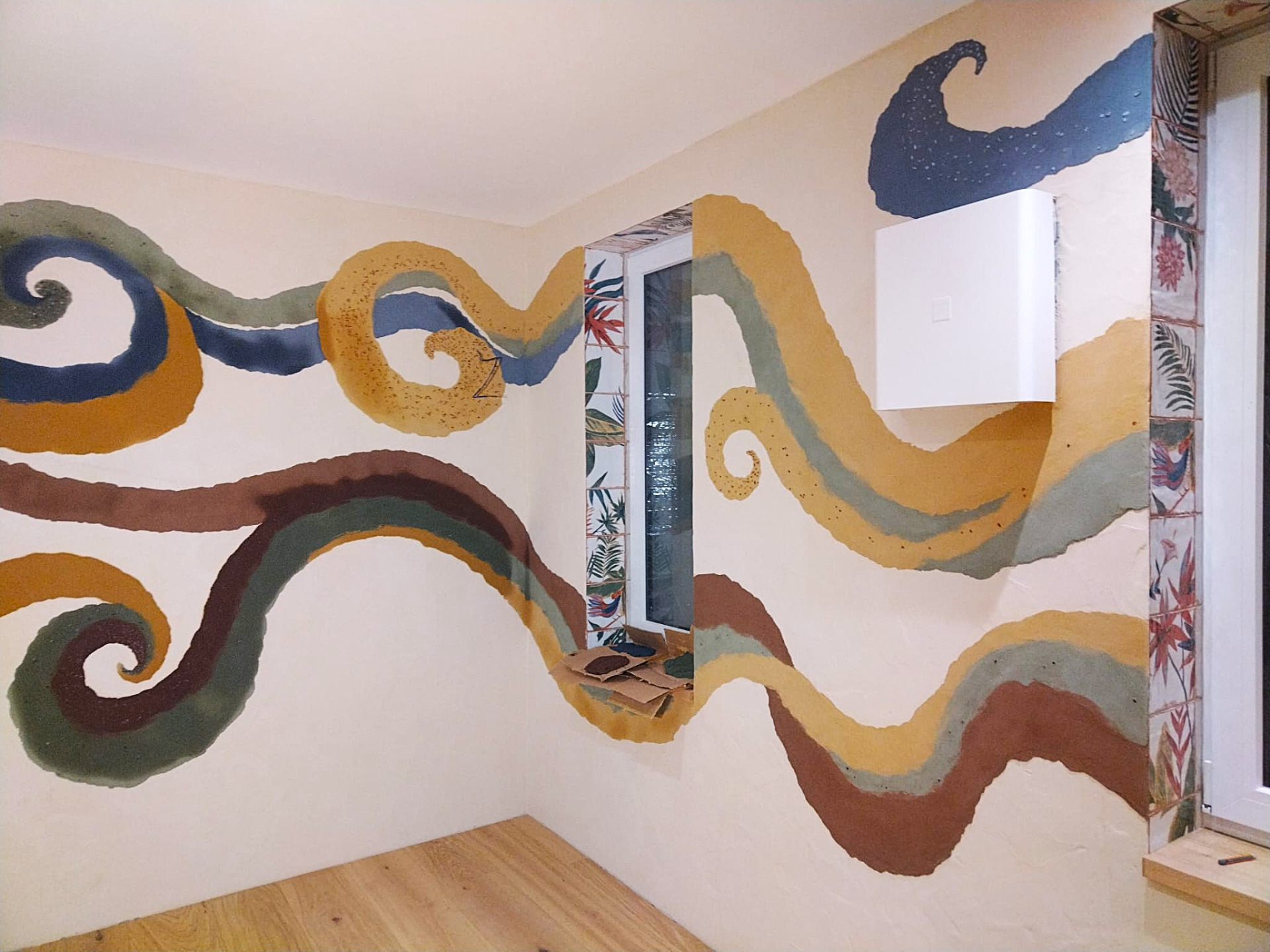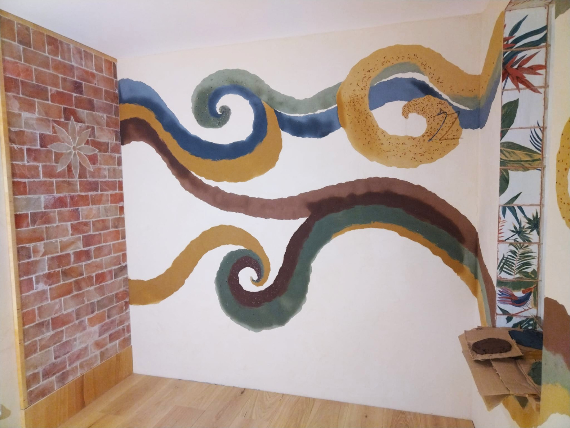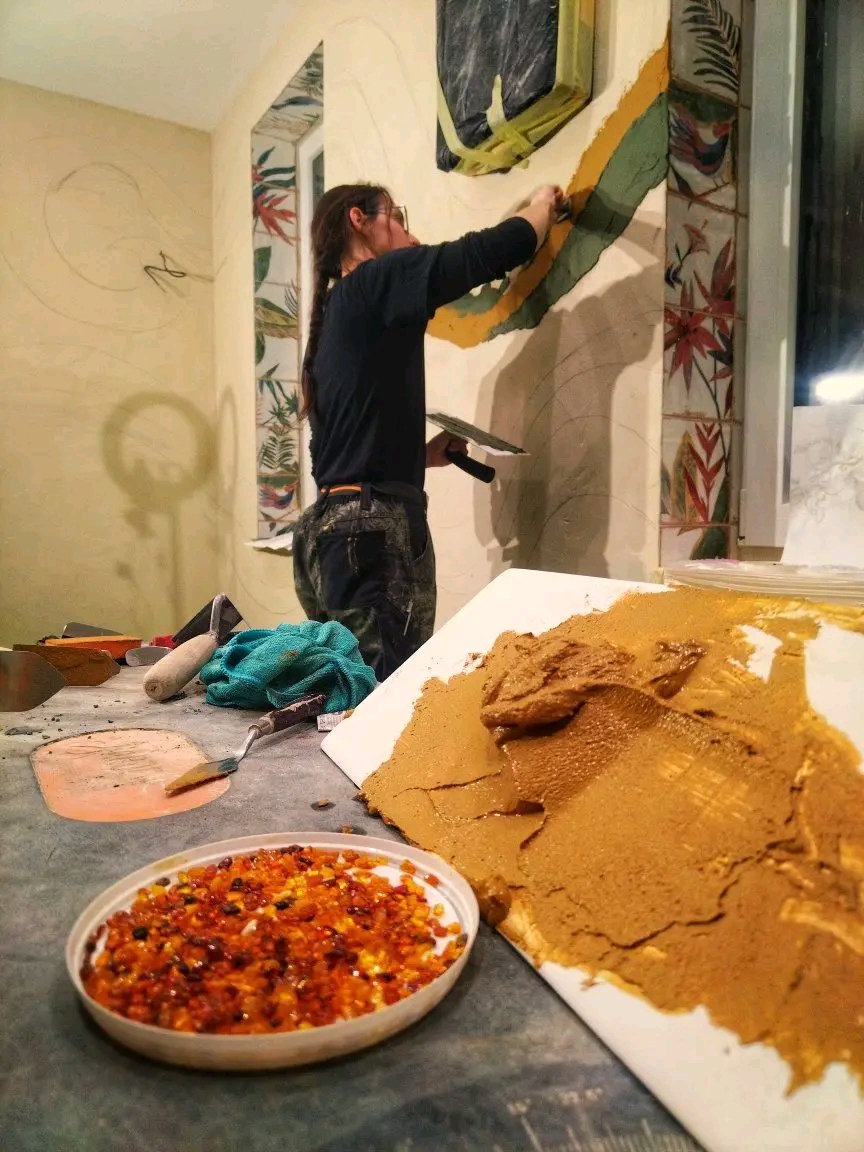 Hlinená dúhová chobotnica, leštená hlinené sedačka, tadelakt vo farbe vanilky a hlinené vanilkové štrukturovano-šúchané omietky.