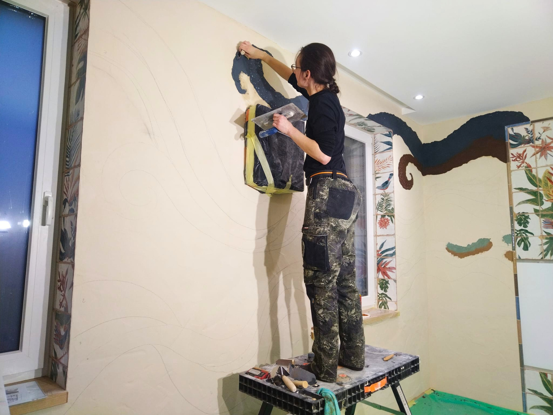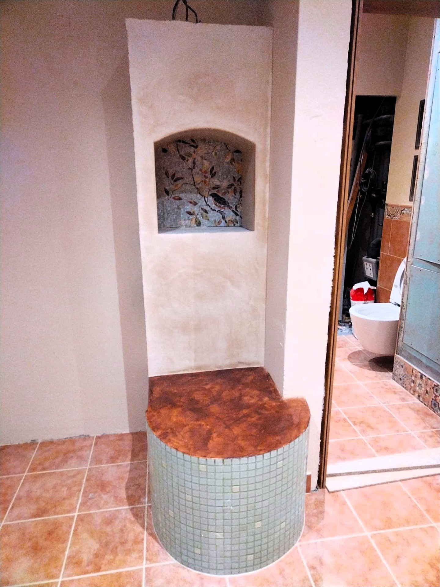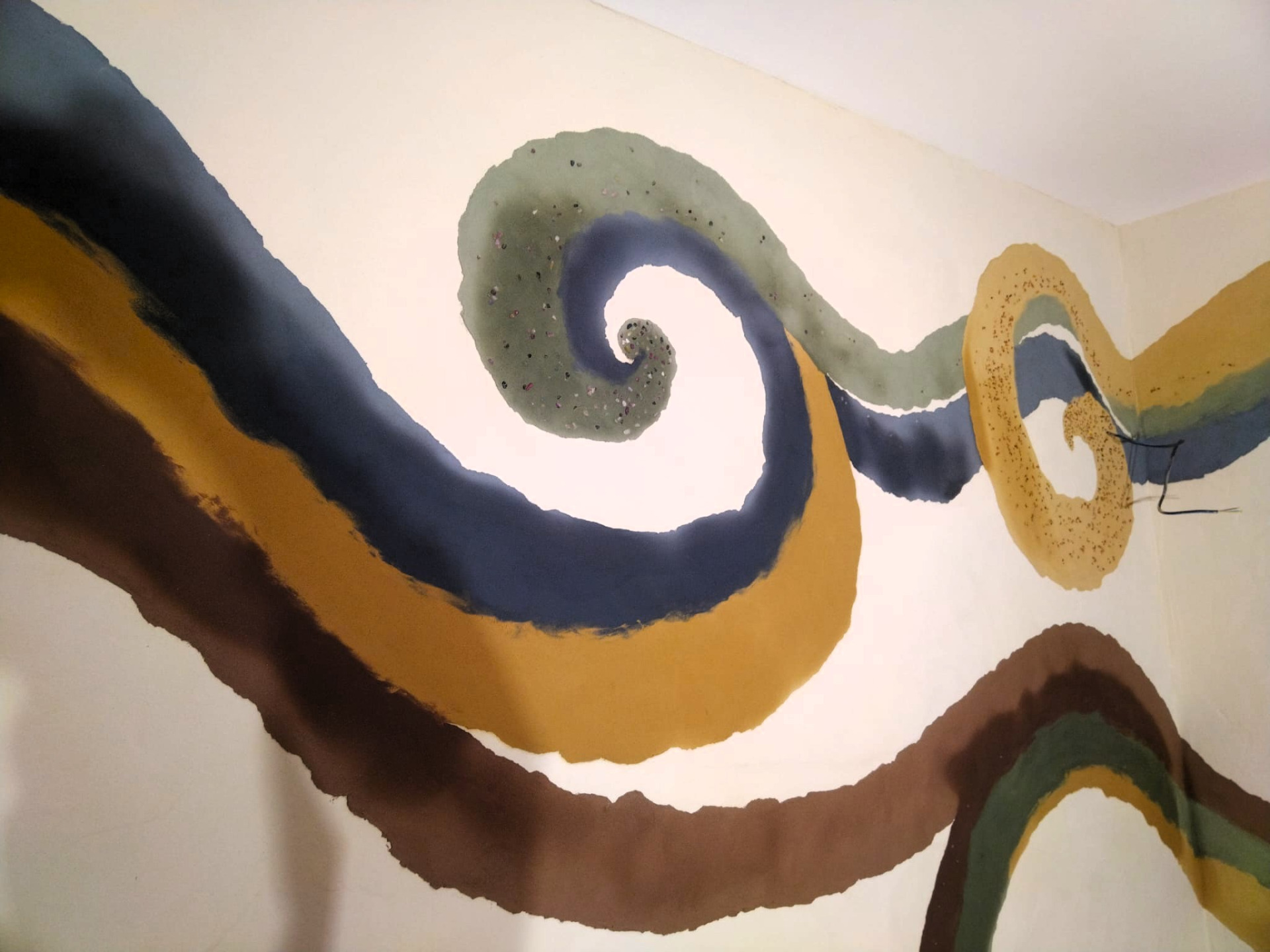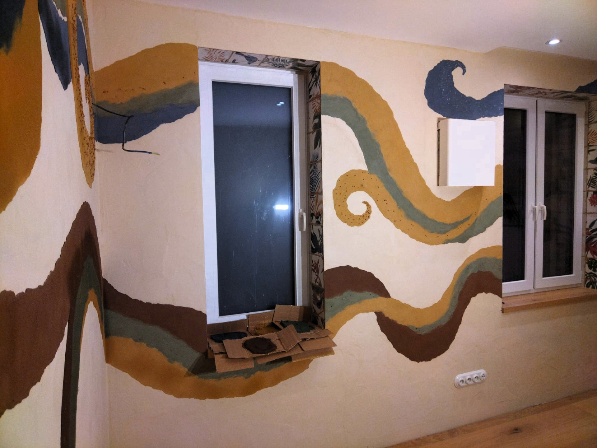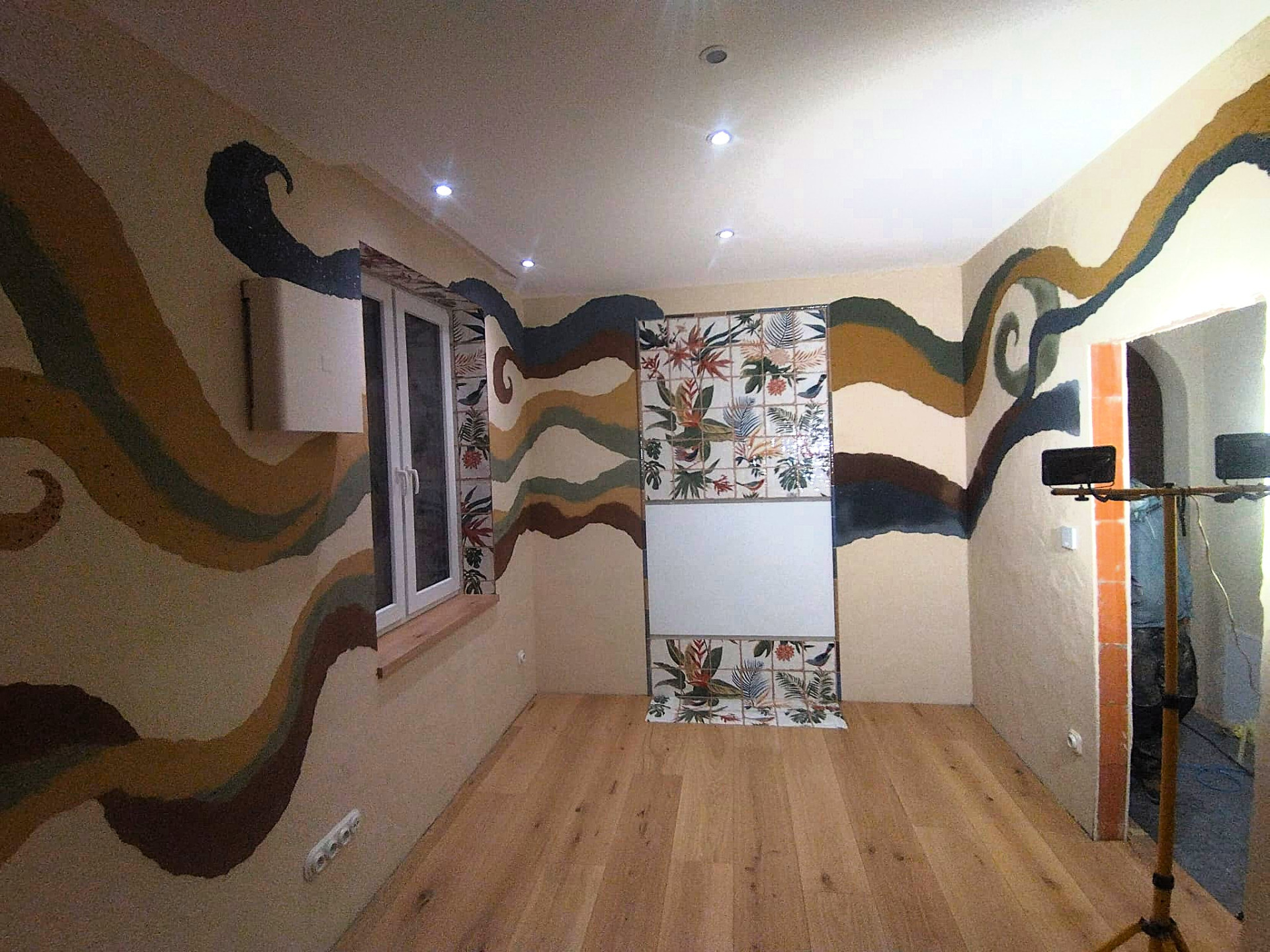 Hlinená dúhová chobotnica, leštená hlinené sedačka, tadelakt vo farbe vanilky a hlinené vanilkové štrukturovano-šúchané omietky.