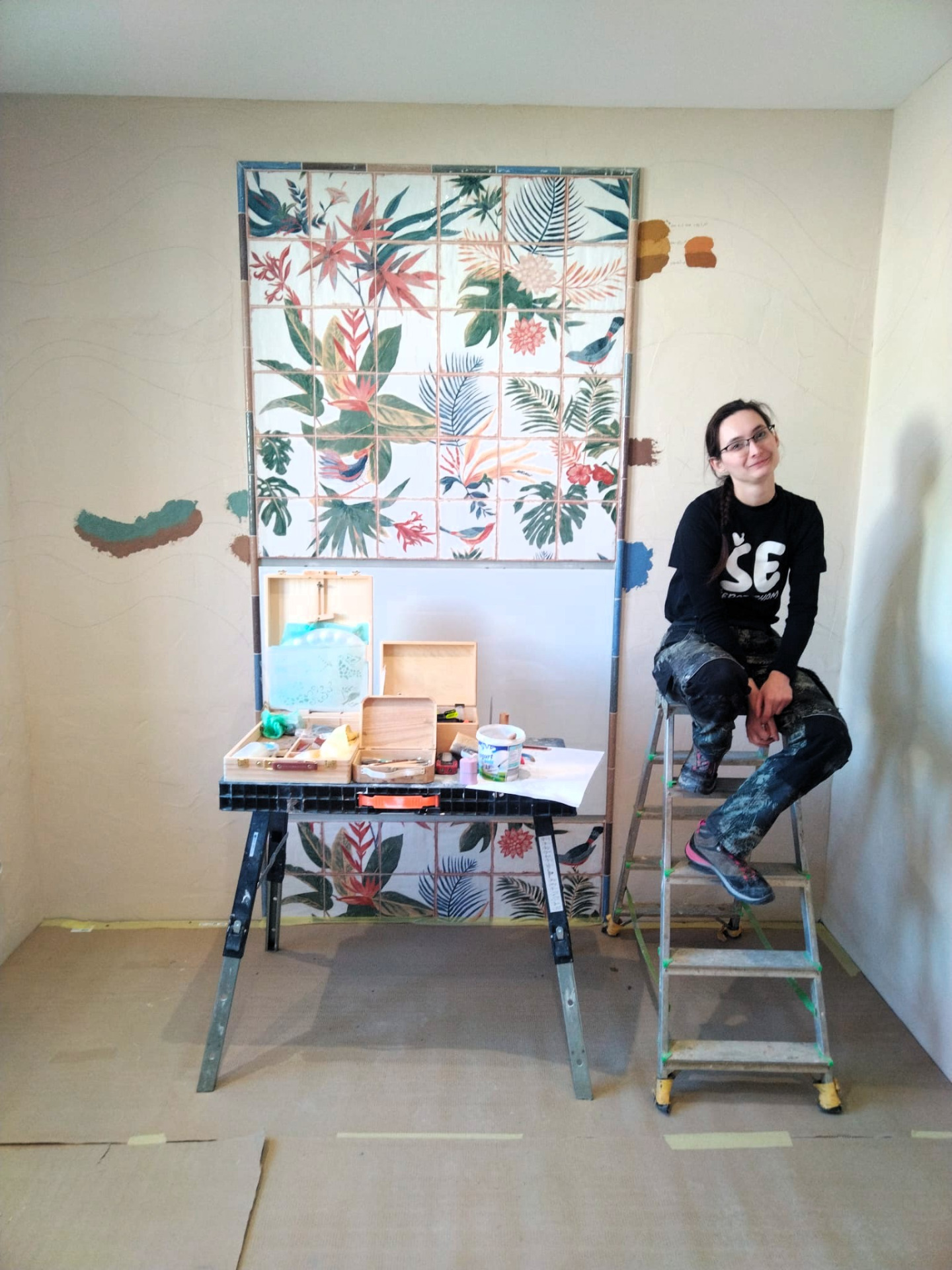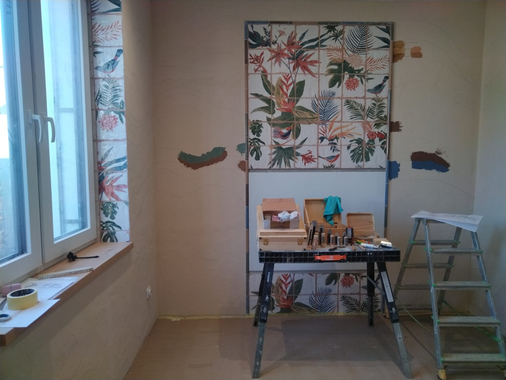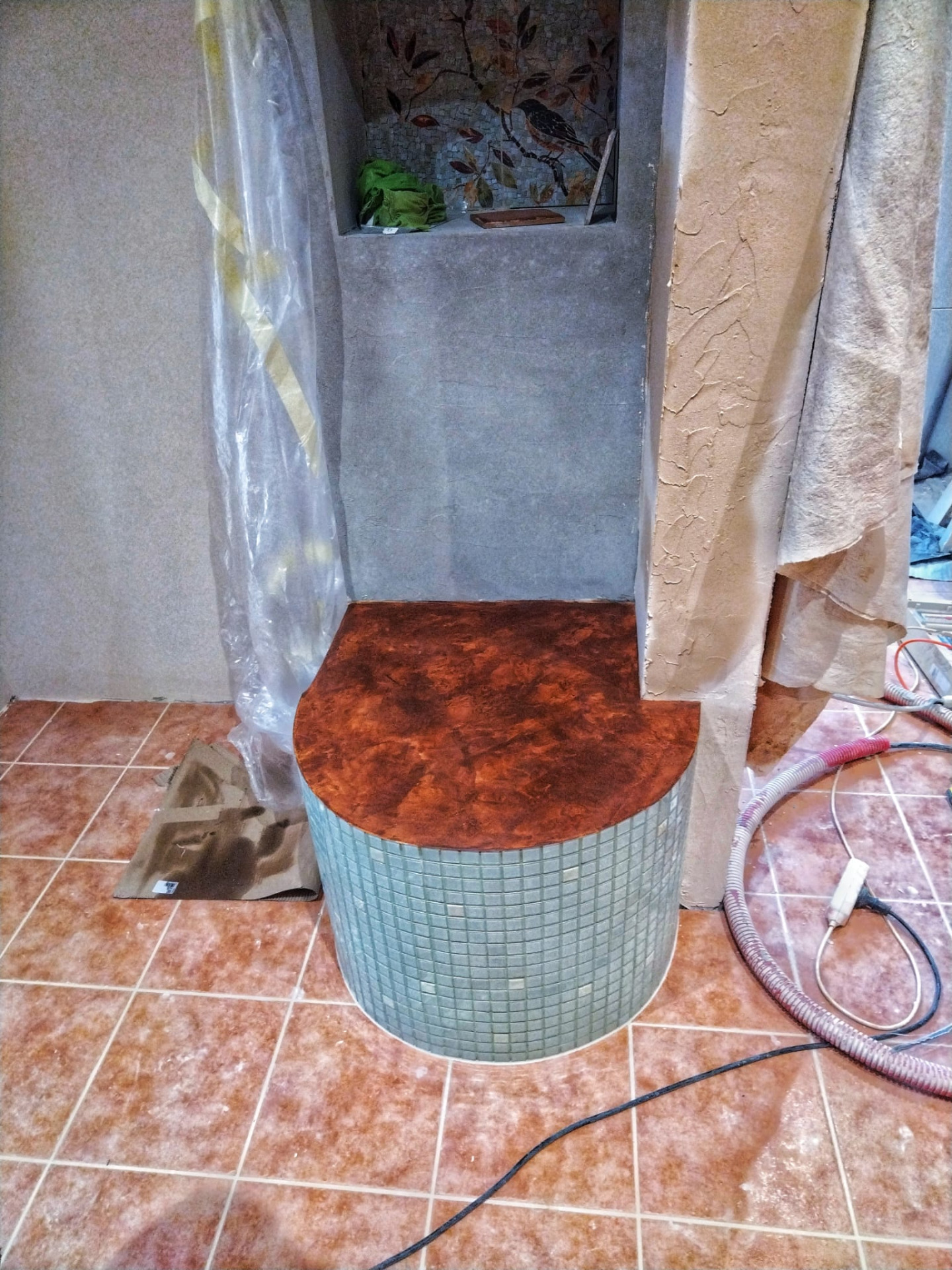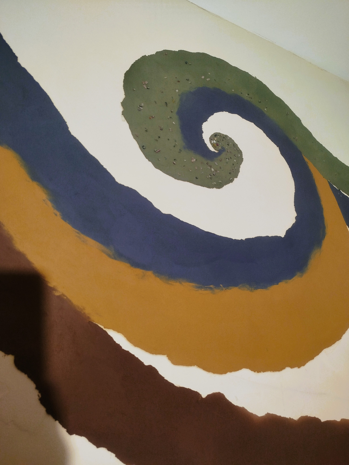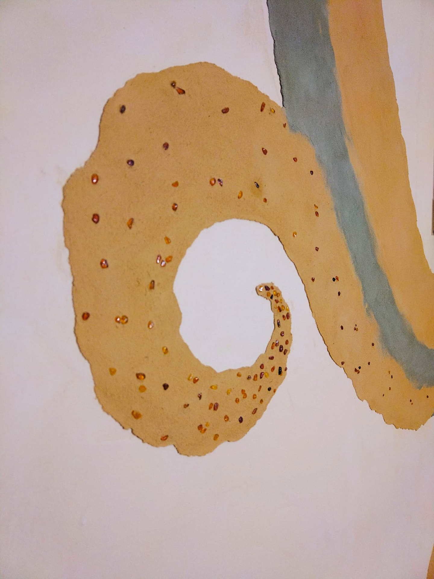 Hlinená dúhová chobotnica, leštená hlinené sedačka, tadelakt vo farbe vanilky a hlinené vanilkové štrukturovano-šúchané omietky.