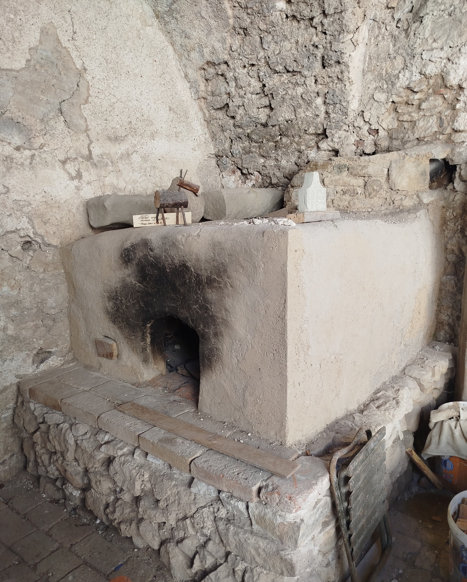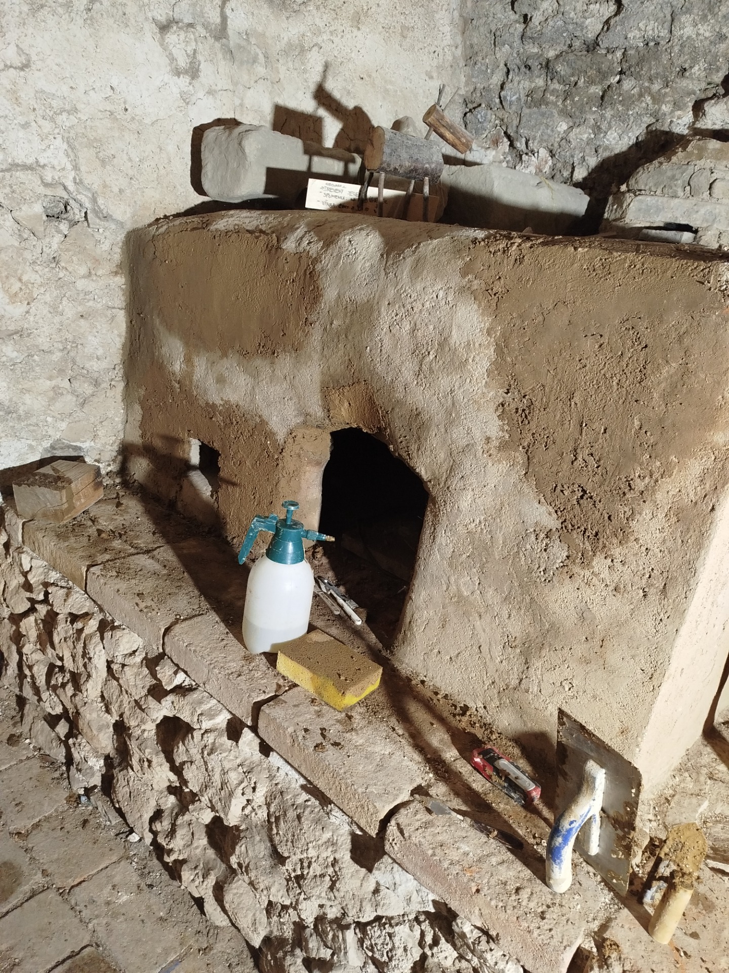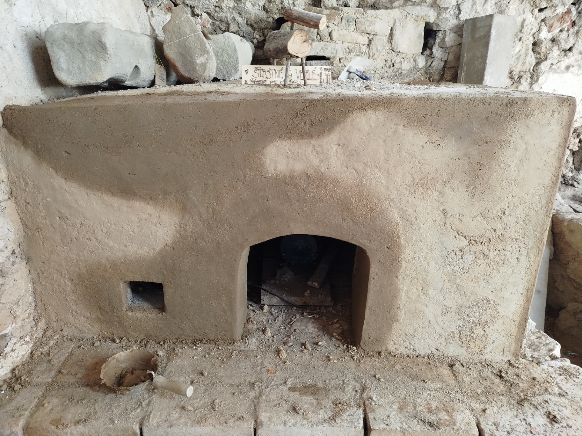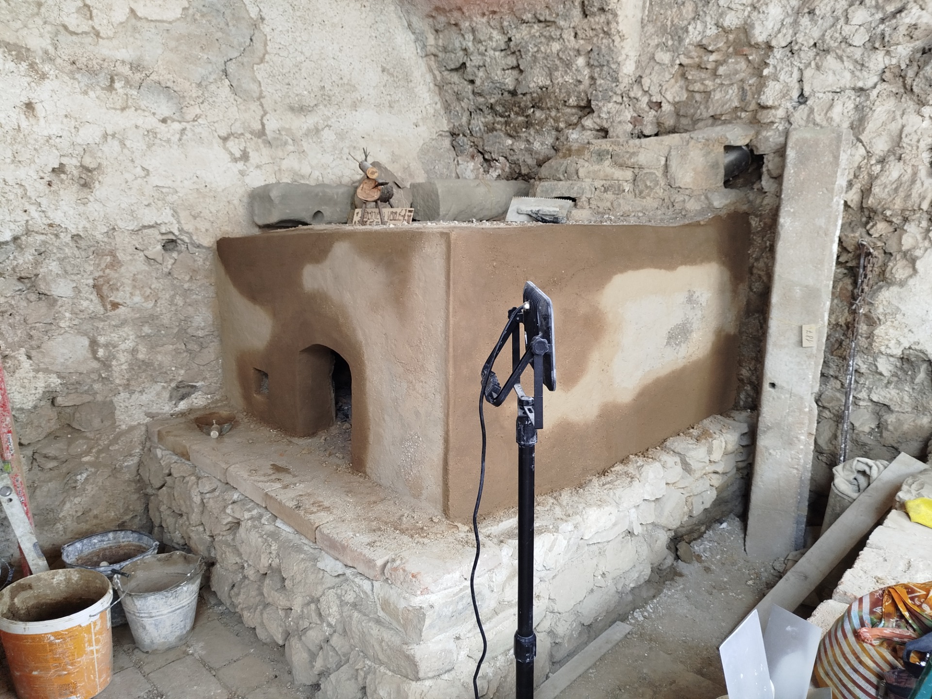 Oprava pôvodnej hlinenej chlebovej pece na hrade Uhrovec podľa pôvodného historického zloženia. Lokálny materiál.